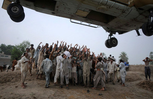 Pakistani villagers raise hands to get food dropped from an army helicopter at a flood-hit area of Kot Addu, in central Pakistan on Saturday, Aug. 7, 2010