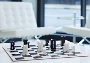 One of a limited edition of 50 typographic sets based on the Champion (Lightweight) Gothic font, created by Sutherland at Hat Trick Design in the UK. (the King is 5cm tall, the pawns, 3cm)
