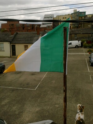 Let Ireland Shake Admin at 6:45 pm June 10, 2012 Gareth Williams writes: For the night that’s in it. Our cat PJ Harvey looking patriotically at the Ireland flag I put up on our house. FacebookTwitterPinterest
