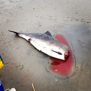 What looks to be a beached Dolphin/Porpoise struggles for life after beaching itself along the shores of Bull Island in [Dublin Bay]…