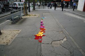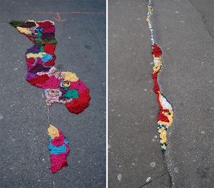 Artist, Juliana Santacruz Herrera transforms the streets of Paris with lengths of dyed, braided fabric, using the many cracks and potholes of the city as her ‘canvas’.