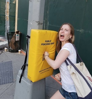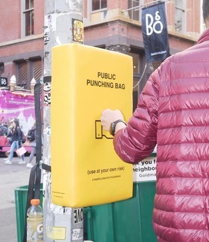 Public Punching Bags installed on the streets of New York City by design studio donttakethisthewrongway during NYC Design Week 2019.