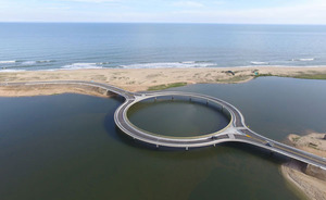atThe proposed Laguna Garzón Bridge between Rocha and Maldonado in Uruguay. Designed by architect Rafael Viñoly to calm traffic and minimise the impact on the sensitive ecosystem of the lake beneath, it’s described as a ‘lagoon within a lagoon, observatory, tourist attraction and fishing spot’.