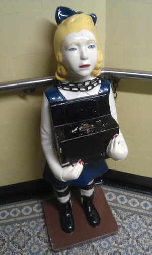 While rambling through the sprawling corridors of Cappagh Hospital [Finglas, Dublln] this plaster cast nightmare scared the bejesus out of me. Chained, as it was robbed before (must be interesting security footage somewhere), is it an obscure child slavery charity? Either way it must not pull in much money as the scary child is the more valued (via the crook-proof chain) and not the money box.