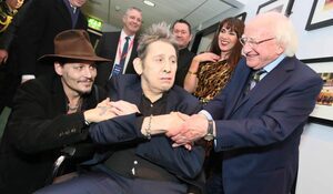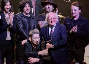 Shane MacGowan on the occasion of his 60th birthday is celebrated by President Michael D. Higgins and a line-up that included Bono, Nick Cave, Bobby Gillespie of Primal Scream, Glen Hansard, Camille O’Sullivan, Johnny Depp, Sinéad O’Connor, Cerys Matthews, Carl Barat of The Libertines, Lisa O’Neill, Finbar Furey, Glen Matlock of The Sex Pistols, Clem Burke of Blondie, Cáit O’Riordan, Spider Stacy, Jem Finer, Terry Woods of The Pogues, and more.