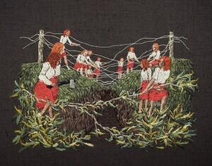 Meditations of the Berlin Wall by artist Diane Meyer in which present day photographs are meticulously hand-stitched, blurring those parts of the scene that were once bisected or obscured by the wall.