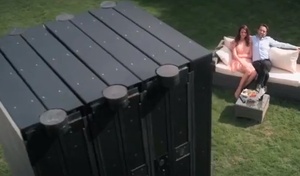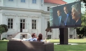A screen diagonal of 262 inches (nearly 22 feet) or 6,65 meters; ten integrated high-end speakers for 9.1 cinema surround; an integrated 4k media server and a custom fabric cover (disguising the ultra black screen as a huge painting when not in use) that folds back with a touch of the remote to reveal the enormous ultra high definition LED gogglebox.