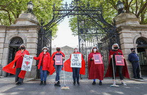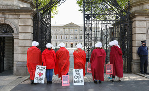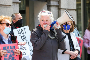 Lord Mayor of Dublin Hazel Chu and Solidarity–People Before Profit TD Brid Smith with protestors from the Repeal the 8th movement outside Leinster House, as they call on Minister for Health Stephen Donnelly to ensure that the National Maternity Hospital will be fully secular, and will be under no Church control.