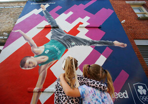 Sports-loving tykes pay tribute at murals (sponsored by Irish Olympic team partner Indeed) dedicated to modern pentathlete Natayla Coyle (top) and gymnast Rhys McClenaghan, both competing at the Tokyo Olympics.