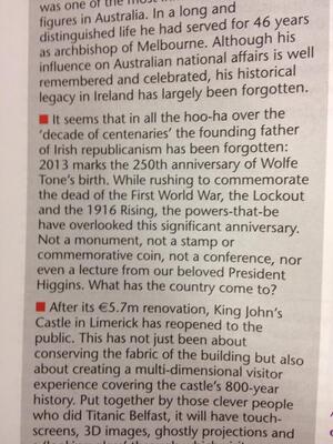 History Ireland is displeased that there are no commemorations of the 250th anniversary of Wolfe Tone’s birth